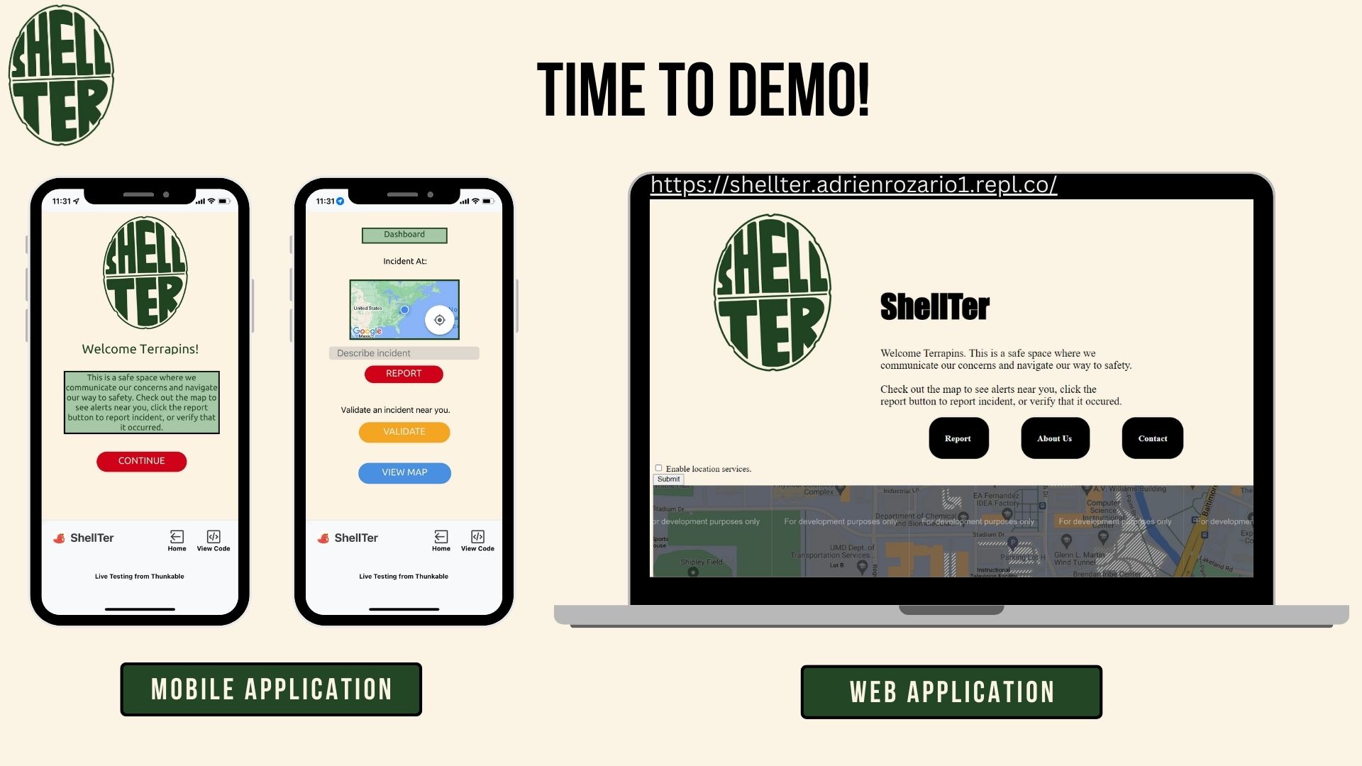 ShellTer is both an app and a website that allows a student or staff on campus to view reports of incidents in the area, report their own incident, or validate an incident that they witnessed. It serves as a platform for communicating and navigating to safety quickly and effectively.